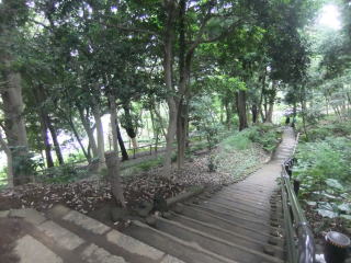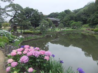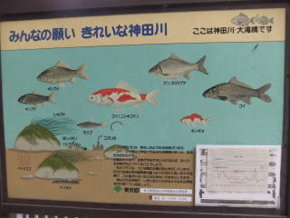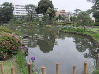 中に「ギンブナ」というのもある。ギンブナは昔から日本にいる在来種(通常「フナ」という)で、子供の頃は近くの池や川で普通に釣れたり取れたりしていた。 ブラックバスが繁殖して、小魚は殆ど食べられてしまい、ヘラブナ(ゲンゴロウブナ)や鯉の成魚は見かけるけれど、数は少ない。おそらく稚魚の頃にブラックバスに食べられて、食われないほど大きく成長できるのは限られているのだろう。 ![]() このパネルの立つ大滝橋、椿山荘、芭蕉庵を通り過ぎ、 次の橋の右手に水神社を見て1分も行くと「肥後細川庭園」の南門がある。 門をくぐると右手に「小池」、左手に「中池」がある。
