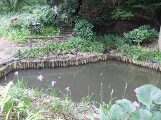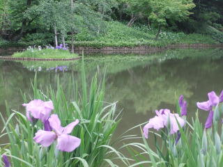 休憩所の間を平地に下りると、大池が広がり、岸辺には色とりどりの肥後花菖蒲が咲き乱れている。
