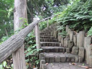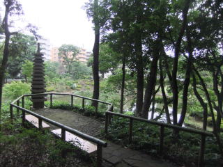 今度は下方の池の光を見ながら、樹間の緩い下りの小径をたどり、休憩用に造られたテーブルやベンチのある平坦な台地に着く。 すぐ左には石造りの「十三重の塔」が「大池」含む庭園を見おろしている。 (「十三重の塔」にはいろいろな意味や解釈があるようなので、知識のない私はヘタな説明も引用もしないから、気になったらネットで検索してみてください。)