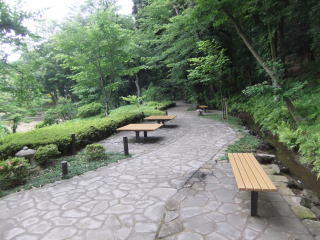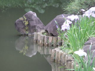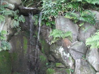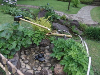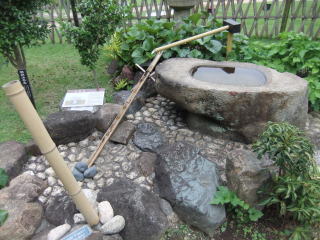 滝から池に注ぐ小川(パンフレットには「やりみず」と書いてある)に沿って歩くと、先ほどは見落とした、というか、小道から池方向の脇道に入ったので通り過ぎたけれど、芝生の中から時折「カーン」という長閑な音を響かせていたものの正体「鹿(しし)おどし」に立ち寄る。 しばらく待つと、竹筒に水が満ち、それが「お辞儀」をしてもとに「直れ!」をすると石に当たって、あののどかで澄んだ「カーン」を響かせてくれる。