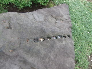 広場の隅に大きな平らな石があり、その面に小さな穴がいくつかあいている。雨水でこんな規則正しい穴が開くわけもないので、鏨(たがね)を打ち込んだ石切りか石割の途中の穴の跡かとも思うけれど、確かなことはわからない。