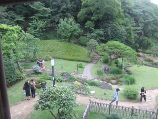 窓の下の庭には何か日本風な仕掛けや灯籠も見える。