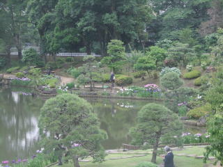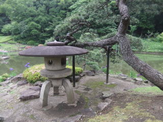 何気なく通り過ぎたが、後で英語のパンフレットを見ると、この雪見灯篭の説明が「three-legged stone lantern」となっている。三本足の灯籠と言うことで、写真で確認すると確かに三本脚だ。頭から4脚だと思っていた自分の、風景を眺める目がどれだけいい加減かを知った。 小径の反対側は築山になっていて、その上からは庭園が見渡せる。
