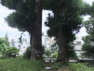 石段の先の樹木に覆われた小高い境内には2本のイチョウの大木が鳥居のように参拝者を迎えている。
