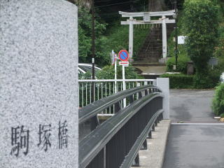 「駒塚橋」の右の駐車スペースの奥に鳥居が見える。