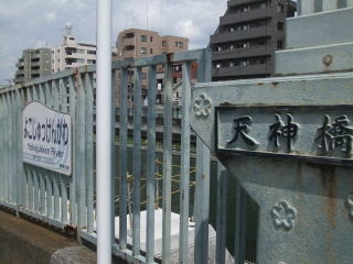 公園を斜めに横切り、墨田総合体育館横を東に、突き当りを少し北上すると蔵前橋通りに出て、右を見ると横十間川を跨ぐ「天神橋」が見える。