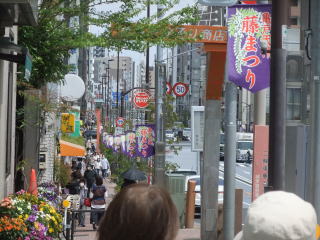 天神橋のその先の、いつもの(ここを通るのは3回目になるかな)和菓子の「船橋屋」の店先の藤棚には満開の藤の蔓が垂れ下がり、行列を作って入店を待つ人や、通りがかりの人たちがカメラを向けている。私も数枚撮る。