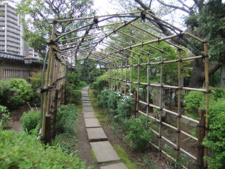 その左奥には、布袋像の脇に萩のトンネル。