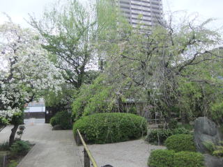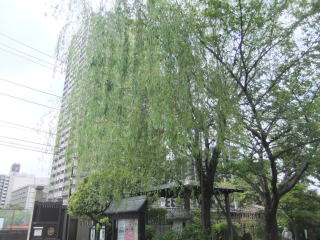 境内を半周して門に戻ると、門の内側には「龍眼寺の柳」の大木が四阿を覆うように聳えている。