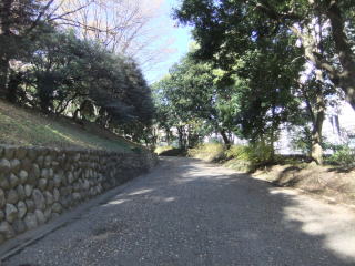 緩い坂道の左側は立派な石垣が続き、右側はケヤキ?の並木が続く。