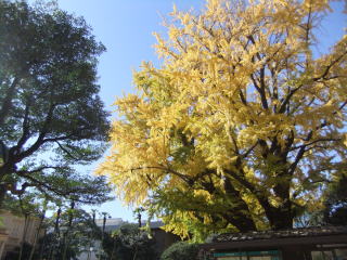 受付棟の後ろにイチョウの大木があり、黄色というより黄金色に輝いている。