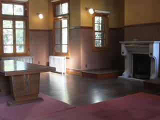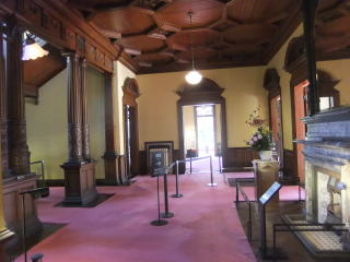 天井が高く開放感のある正面玄関の右手には大きな暖炉がある。その後で歩いた各部屋にも立派な暖炉が備えられていた。 冬にはきっと相当手がかかったことだろう。