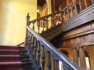 次に2階に上がる。大階段は100年以上磨き上げられて黒褐色に輝き、手摺に優美な彫刻がほどこされている。
