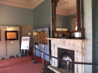 順路の矢印に従って左奥に進むと、ホールの暖炉の口の上の壁には大きな姿見(洋風に言えば「ドレッサー」か)が、装飾と実用を兼ねて掛けられている。
