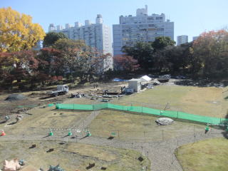 芝生の広い庭だが今は改修中で、建機が入っているから、残念ながら優美な姿は無い。