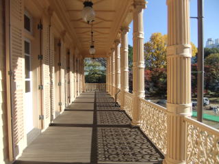 ベランダの柱は古代のギリシャ建築を思わせるような白い柱の列。柱の上端に特徴的な装飾が施されている。