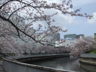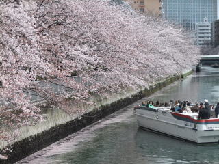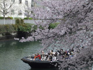 今日は文字通りの「花曇り」の下、橋(石島橋)の上から桜を愛でる人、写真を撮る人、岸の散歩道の桜並木の下を散策する人、そして川面をゆったりと滑る船からを見上げる満員の船客たち。