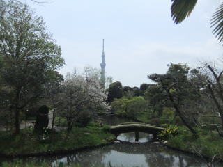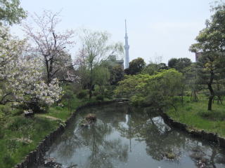 その先には池があり、橋の上からスカイツリーが見える。