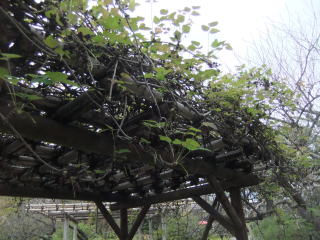庭園の中央辺りに、蔓花の棚が4つあり、その3つは大きな藤棚で、もうひとつは少し小さな「ミツバアケビ」の棚。