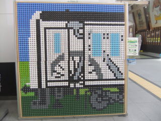 そして、また(これも、いつものように)改札口前で壁を見上げて歴代の横綱の写真や手形を眺めて、外に出ようとしたら手前に大きなちぎり絵のパネル。