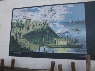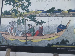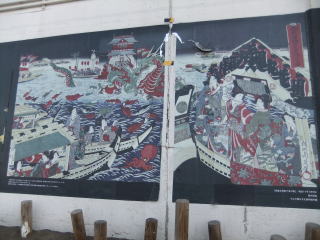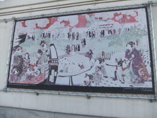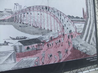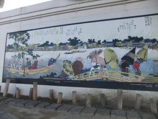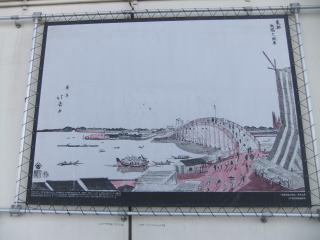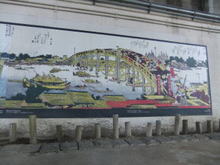 隅田川テラスの壁には、江戸時代の浮世絵の中の両国をテーマにした絵が、大きなパネルやクロスにプリントされて、画廊のように展示してある。
