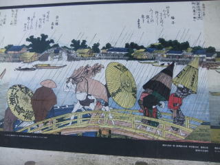 両国橋を背に、川上に向かって歩く。 葛飾北斎、歌川広重や豊国の作品も並んでいる。