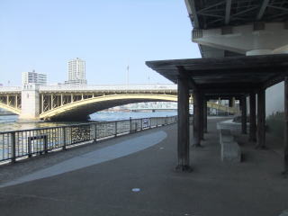 総武線陸橋とビルの間の路地を川の方に進むと、堤防の上り階段があり、それを上ると「隅田川テラス」に出る。