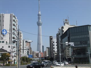 隅田川テラスから堤防の上に上がると、川上には赤い吾妻橋が見え、橋のたもとの五差路の広場(?)から伸びる道路の正面に、遮るものもなくスカイツリーすっきりと見える。ここは本所一丁目。