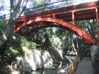 頭上の朱色の橋が木々の緑と相まって存在をアピールしている。