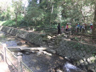 川に架かる小さな橋を、おそるおそる渡り、渡り切ると歓声を挙げている。