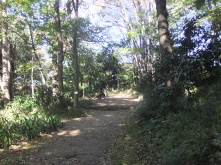 道路の向こう側に、建物の間から森が見える。駅から3,4分歩くと、路地というよりやや広めの道路が右に入っている。
