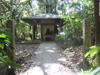 せせらぎを楽しみながら進むと、右手の林の枝越しに古そうな小さな庵風な屋根が見える。