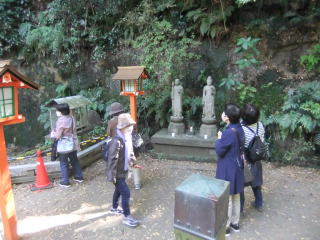 渓谷に降りて「利剣の橋」を渡ると、そこには観音さまと太子さま2人の像が建ち、その隣に細い滝が流れ落ち、またその左の川縁に不動堂が、赤い幟をはためかせている。