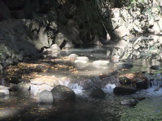水は澄んでいて川床が見える。 残念ながら生き物の姿はないが、小さな段差で秋の陽射しに踊る水しぶきは美しい。