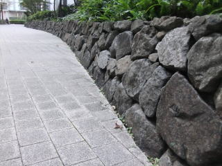 植栽を囲む長い石垣の一部が、大きな石を組んだ「江戸時代の再現版」の石垣。